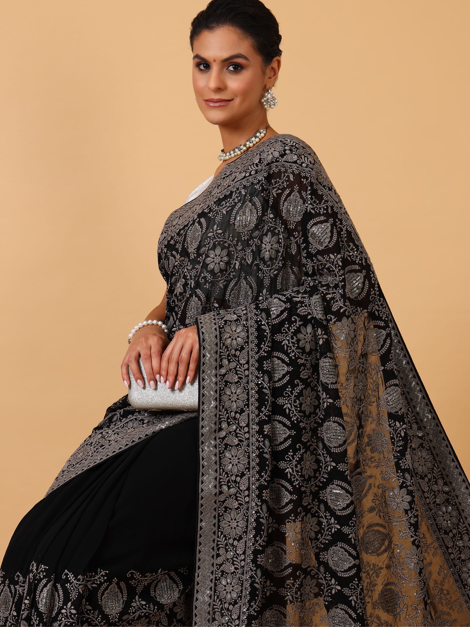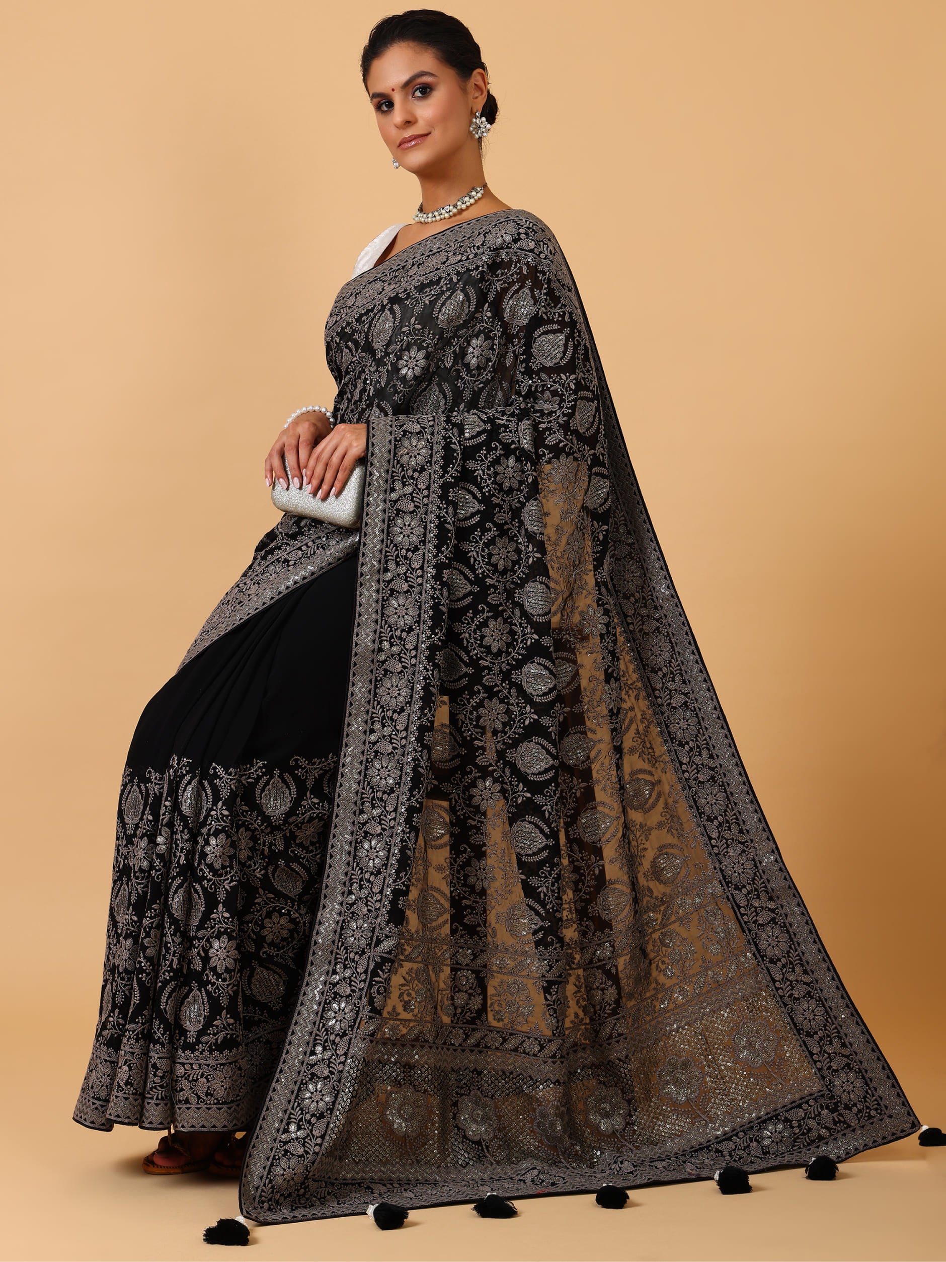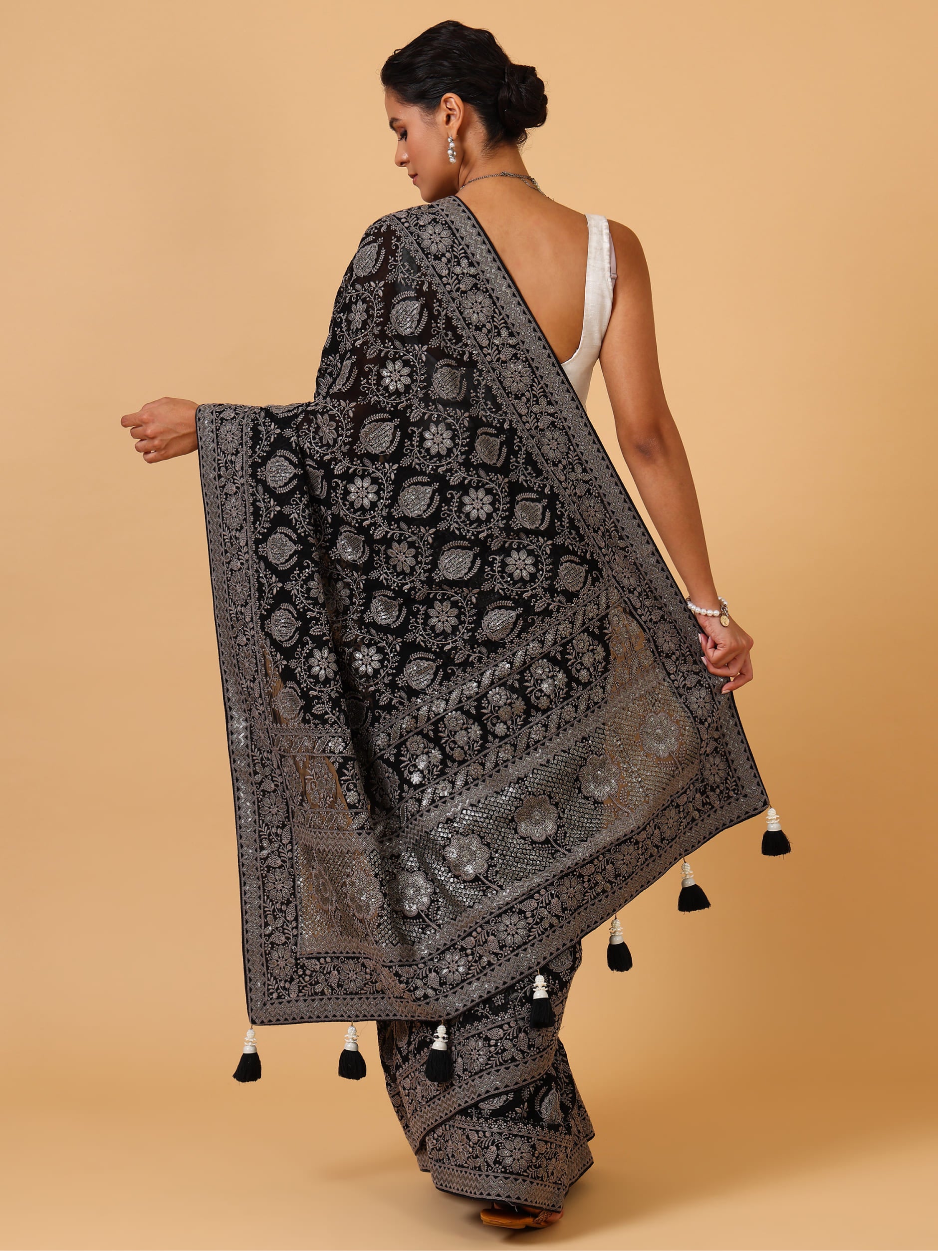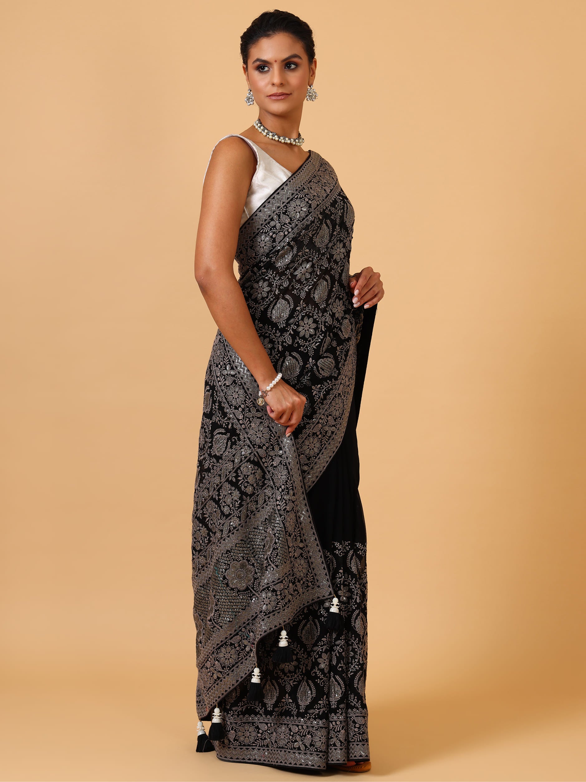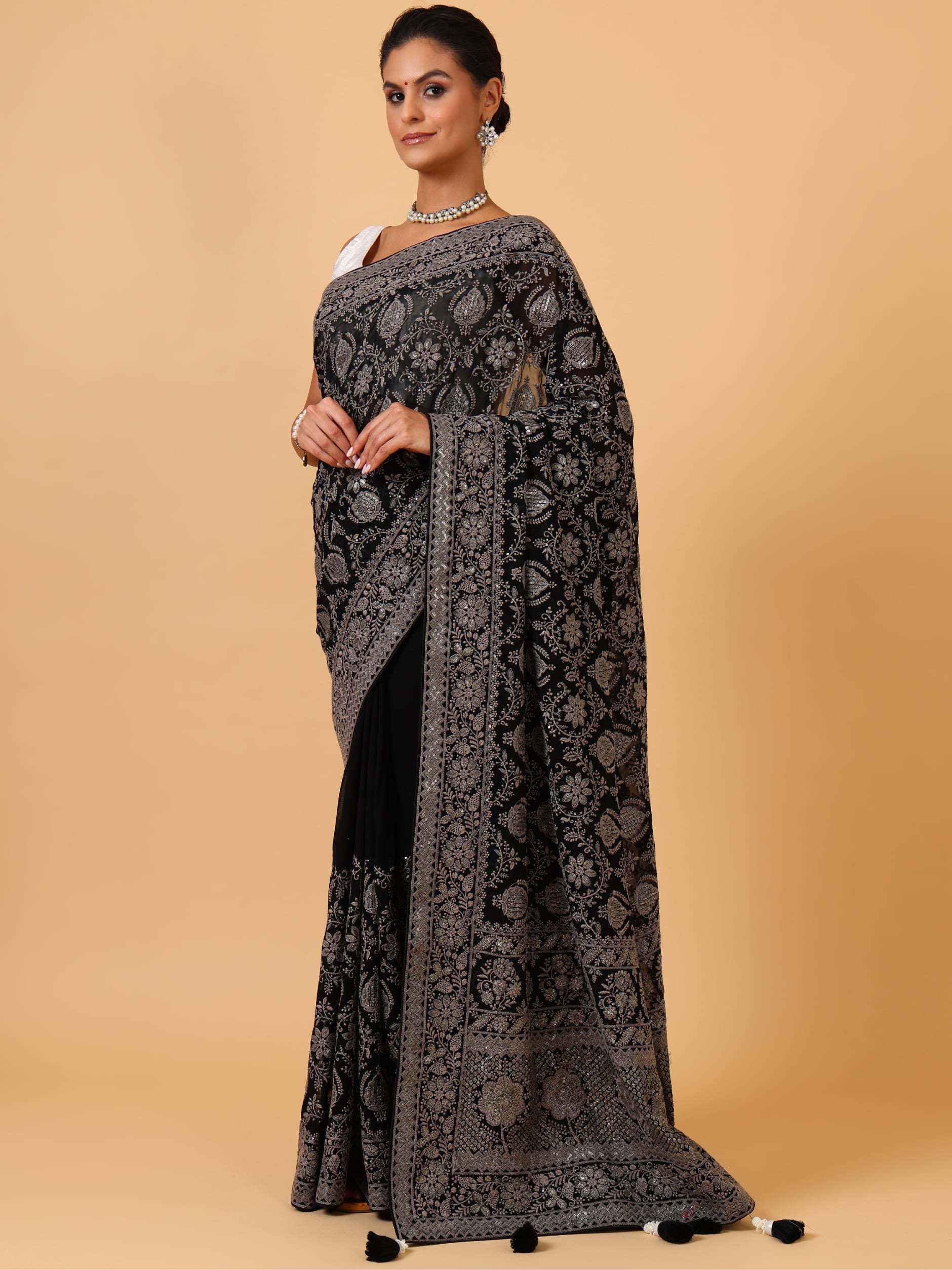 Zardosi work is a traditional form of embroidery that involves sewing gold or silver threads onto fabric to create intricate patterns. It adds a rich, luxurious touch to sarees, making them ideal for special occasions.