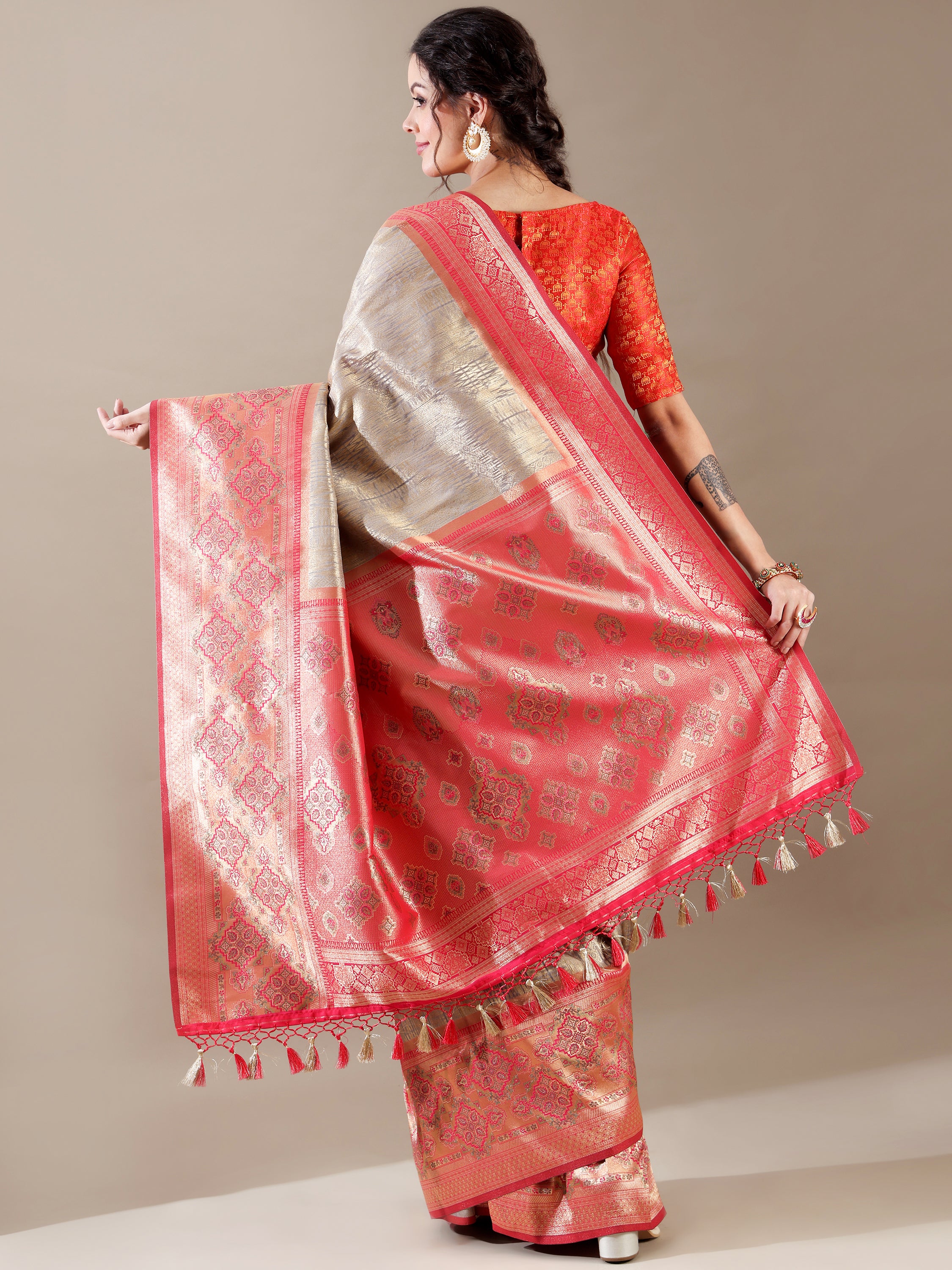 Tissue Kanjivaram sarees are unique due to their delicate tissue-like texture combined with the grandeur of Kanjivaram silk. They often feature exquisite Meenakari and Zari weaving, offering a perfect blend of traditional elegance and contemporary style.