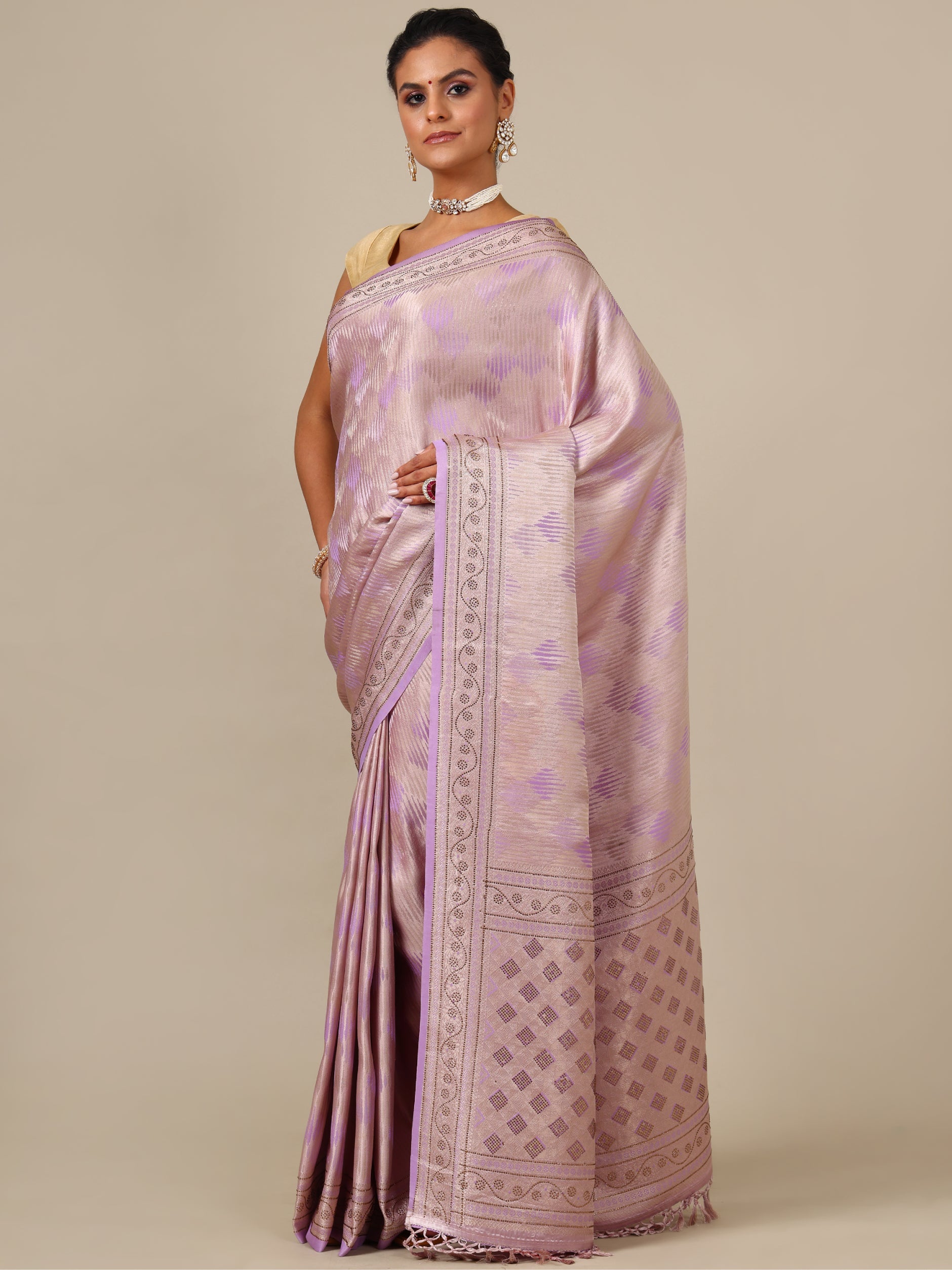 Gazicrape sarees are celebrated for their lightweight texture and rich, detailed embroidery. They often feature hand Zardosi work and intricate Buti patterns, making them a perfect blend of comfort and elegance.