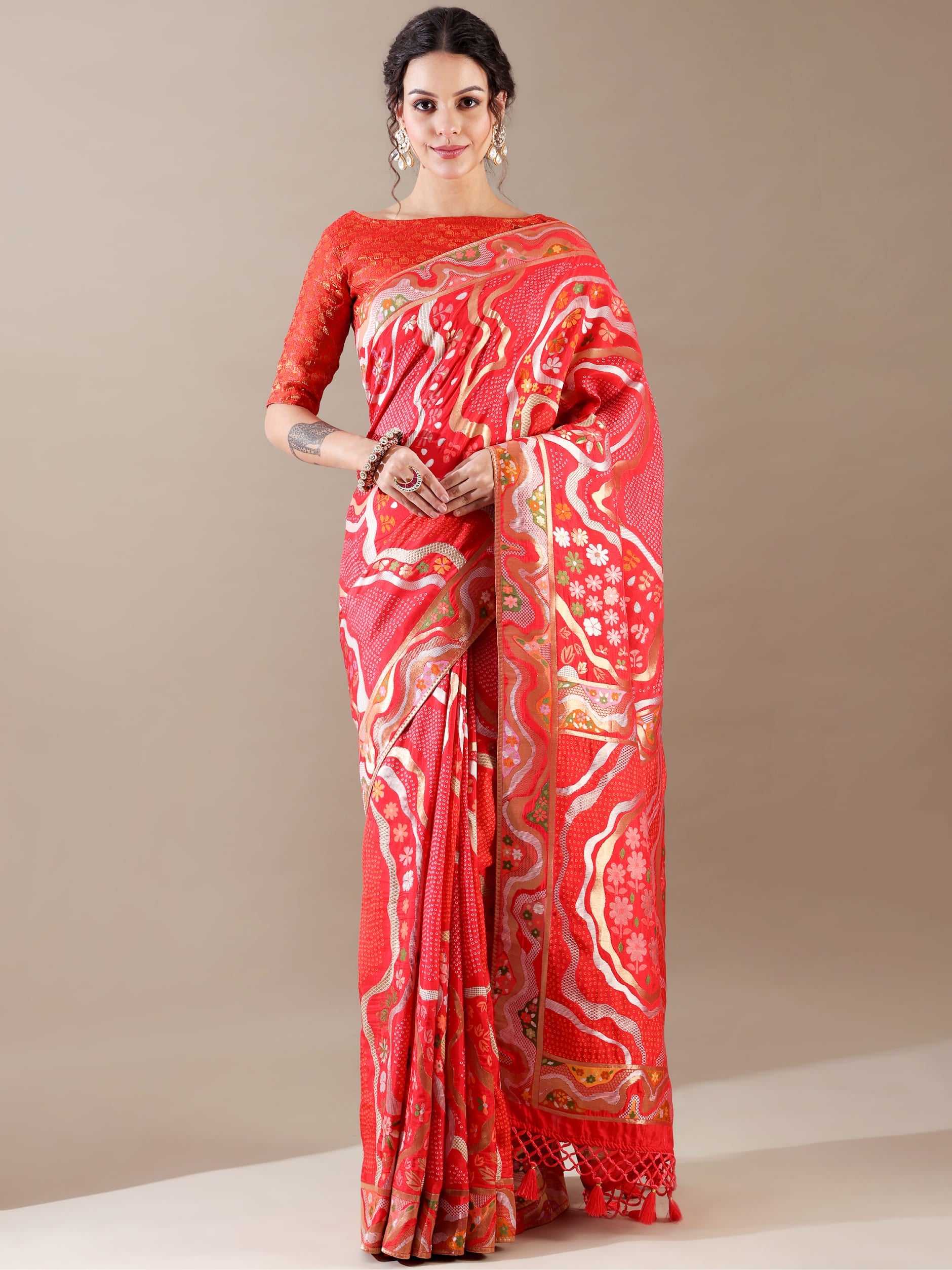 Embrace traditional elegance with this red Dola silk saree featuring beautiful weaving work. The rich red hue enhances the luxurious texture of Dola silk, offering a graceful drape and refined finish. Paired with an unstitched matching silk blouse, this saree is ideal for festive events, weddings, and special occasions.