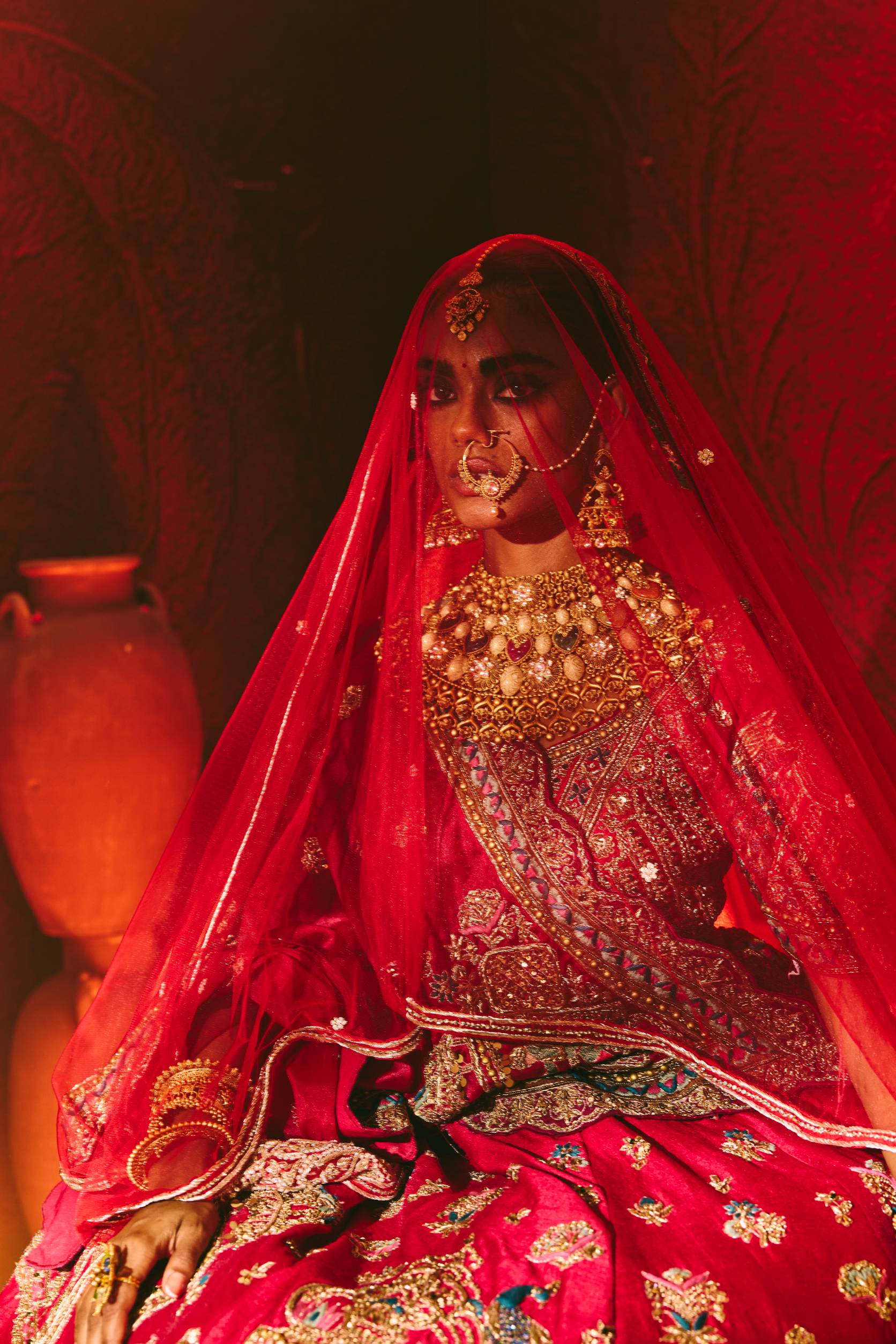 Designed in luxurious Tissue, this peach ensemble radiates timeless sophistication. Embellished with fine zardozi work, it highlights handcrafted excellence. An effortless choice for modern celebrations with traditional appeal.