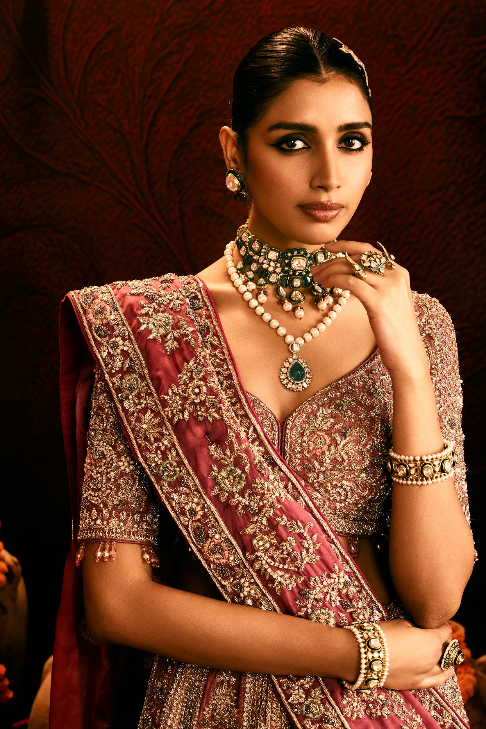 Gazicrape sarees are celebrated for their lightweight texture and rich, detailed embroidery. They often feature hand Zardosi work and intricate Buti patterns, making them a perfect blend of comfort and elegance.