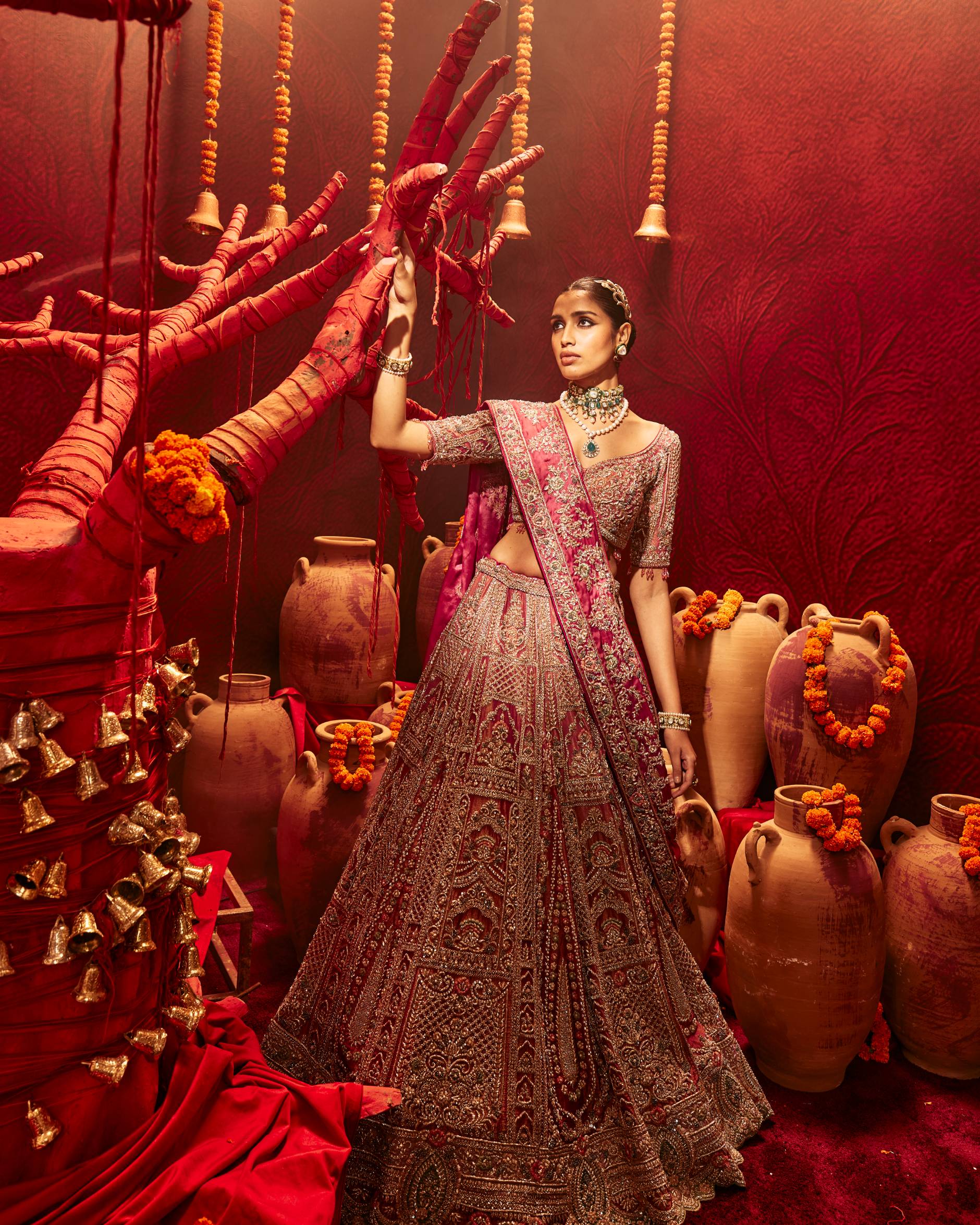 An exquisite ensemble made of Tissue, showcasing the charm of pink. Embellished with fine zardozi work, it highlights handcrafted excellence. Elegant, refined, and made for moments that matter.